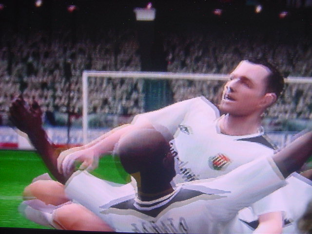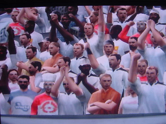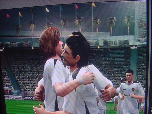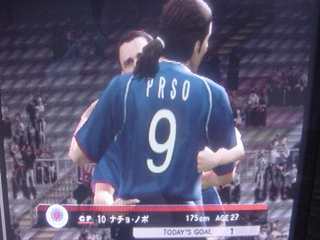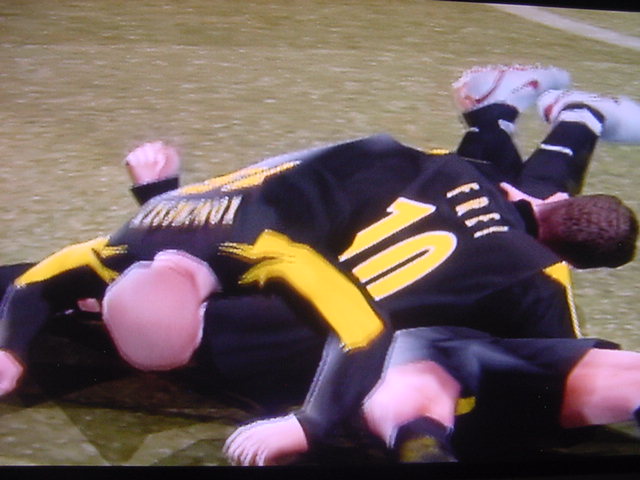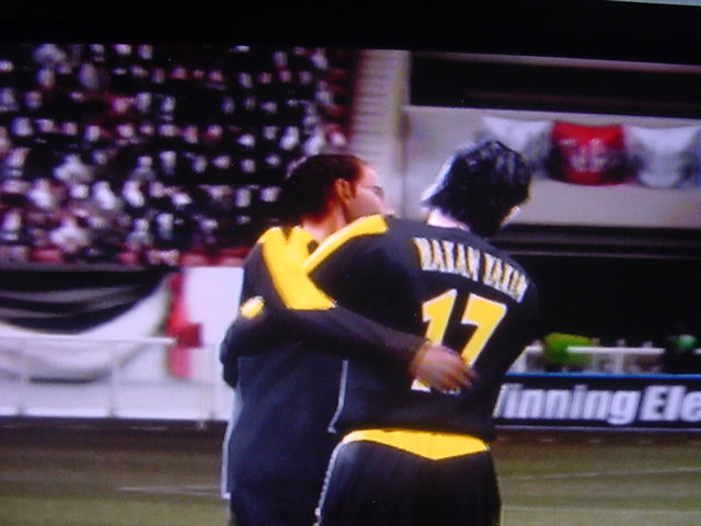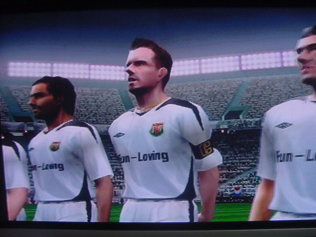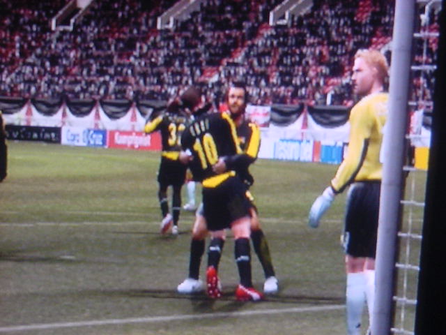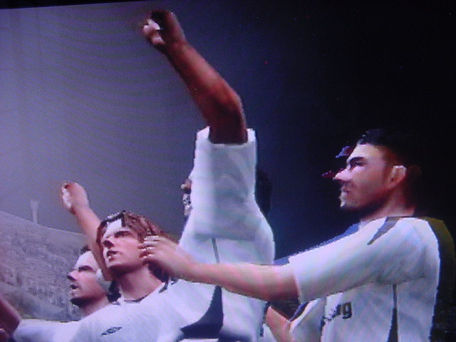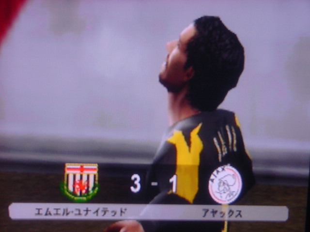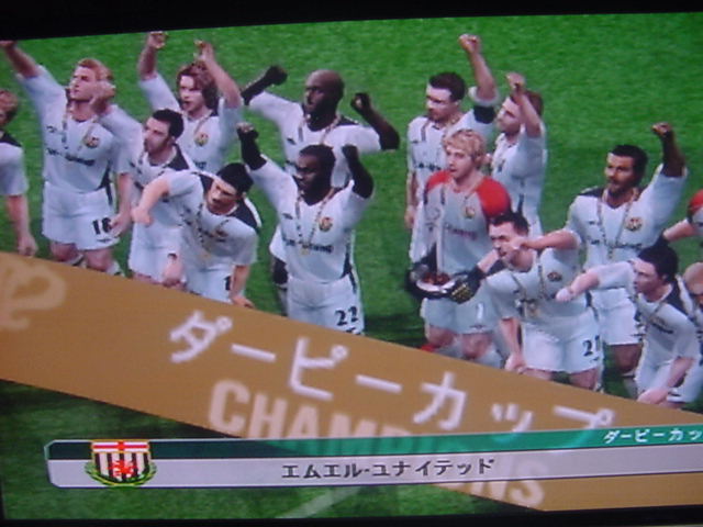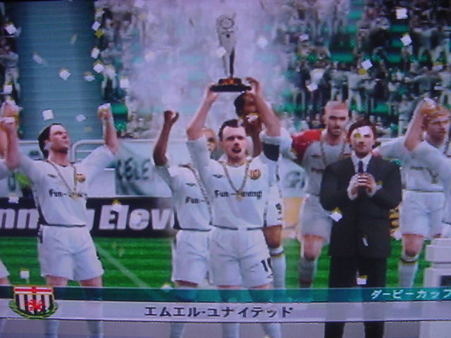 試合前のインタビューでキャプテンのフレイは 「今日は勝つ。それだけ。理由?ホームだからさ」とクールに決めた。 相手側のキャプテンのペレスは 「我々はこの試合で必ず勝たなくてはならない。これ以上ファンに失望 感を味わあせたくはない。」と語った。 選手入場。スタジアム全体に緊張感が張り詰める。 キャプテンのフレイを中心に左にエースのサルバ。右にバタグリア。 一番右端からスナイダー、パベル、フォンクの順 エムエル・ユナイテッド(ENG) GK 1 ロバート・グリーン DF 24 パオロ・モンテーロ DF 4 ガブリエル・ミリト DF 3 ゼッシュ・レーマン DF 15 ポール・コンチェスキー MF 19 セバスチャン・バタグリア MF 8 スティーブ・マクマナマン MF 33 ビル・チャト MF 17 ハカン・ヤキン FW 10 ゲオルグ・フレイ C FW 9 サルバ・バジェスタ アヤックス(NED) GK 31 ハンス・フォンク DF 23 ズネデグ・グリゲラ DF 3 ジョン・ヘイティンガ DF 2 ハテム・トラベルシ DF 15 フィリペ MF 12 アンソニー・オボダイ MF 5 マクスウェル MF 18 ウェズレイ・スナイダー FW 7 マウロ・ロサーレス FW 1 ケネス・ペレス C FW 11 ライアン・バペル 試合開始のホイッスルが鳴り、スタジアムにどよめきが走ります。しかし前半開始早々にスナイダーのミドルがポストをたたくなど相手ペースで始まった試合でしたがエース、サルバが強引に抜け出すとGKの飛び出しとともにシュート。GK真正面でしたが、わきのわずかな隙間をボールが通過するという奇跡が起きて先制点を奪います。 味方全員が駆けつけ、先制点を皆で喜びます。いや~すごい!! 更にペースを取り戻したエムUは勇猛果敢に攻撃を行います。着実に2点目が生まれる時間帯が生まれはじめた前半35分のコーナーキック。ハカン・ヤキンの正確なクロスからサルバがどんぴしゃのタイミングでヘッドでゴールを狙いますがアヤックスのトラベルシがブロックします。 この後もチャンスは生まれますが生かしきれず前半終了。前半のスコアは1-0でリード。しかし、何が起こるかわからないのがサッカーの面白いところでもある。 後半開始。前半のデータだと自陣ゴールをおびやかしていたのはやはりスナイダーだった。そしてアヤックスで最もシュートを打っていたのがバペルだった。やはりこの2人は要注意人物。マンツーマンつけとくか。 しかし、こちらのDF陣もなめてもらっては困ります。冬の移籍マーケットで獲得した百戦錬磨の鉄人モンテーロとアルゼンチンの若きDFリーダーのミリトと実力は1流です。しかし、いまだ連携がとれていないのが現状なのです・・・・。 時間は刻一刻と過ぎていきます。我々もせこいですが守備固めにして時間が経つのを待ちます。しかし、一瞬のスキを突かれて!!!! あーーーーーーーー失点を許してしまいます!!!!!後半36分のことでした。 グリーンもかなり鋭い反射神経で反応しますが指1本届かず・・・。後半出場のアナスタシウにヘディングで決められます。 やばいです。延長戦だけは避けたい。 失点を許してしまって、意気消沈してしまったDF陣。しかし、この男達は燃え尽きていませんでした。30歳を過ぎたオーバー30世代。炎の男マクマナマン。ルーマニアの大砲フレイ。百戦錬磨のディフェンス職人モンテーロ。頼れるエース、サルバ。この4人のメンタリティは見習うものがあります。まだ終わっちゃいないと言葉を交わさなくてもオーラを発している。それだけで分かる。 キックオフ直後。この4人を中心とした怒涛破錠攻撃が始まります。マクマナマンは6分の間に3本のシュートを放つなど積極的に攻撃参加します。そして、延長戦を覚悟し始めた後半47分。なんと炎の男マクマナマンがペナルティーエリアでファウルを受け、PKを獲得します。ファウルをしたのはヘイティンガ。来季エムUに入団濃厚な選手です。 通常ならば蹴るのはキャプテンのフレイですが、ここでは冷静に誰が蹴るのか話し合います。 蹴るのはファウルを誘った本人。マクマナマン。冷静にゴールを見つめてボールを蹴ります。打ったところは真正面。相手GKは左に(GK視点)飛んでゴールネットを揺らします。勝ち越しゴール!! さぁキックオフ!!と同時に終了のホイッスル。遂にエムエル・ユナイテッド歓喜のダービーカップ優勝!!!やりました。スタジアムが歓喜の渦で渦巻いています!!優勝。優勝です!!!感動です!!一時は破産の危機にさらされたクラブが優勝という金字塔を打ち立てました。ありがとう。来季からは1部リーグでの戦いです!!まずは残留。そしてビッグ・イヤー目指して前進あるのみです。突き進めホワイト・セインツ!!!ありがとうホワイト・セインツ!!!1部でも頑張れホワイト・セインツ!! ハカン・ヤキン。2部リーグMVP ダービーカップMVP アシスト王